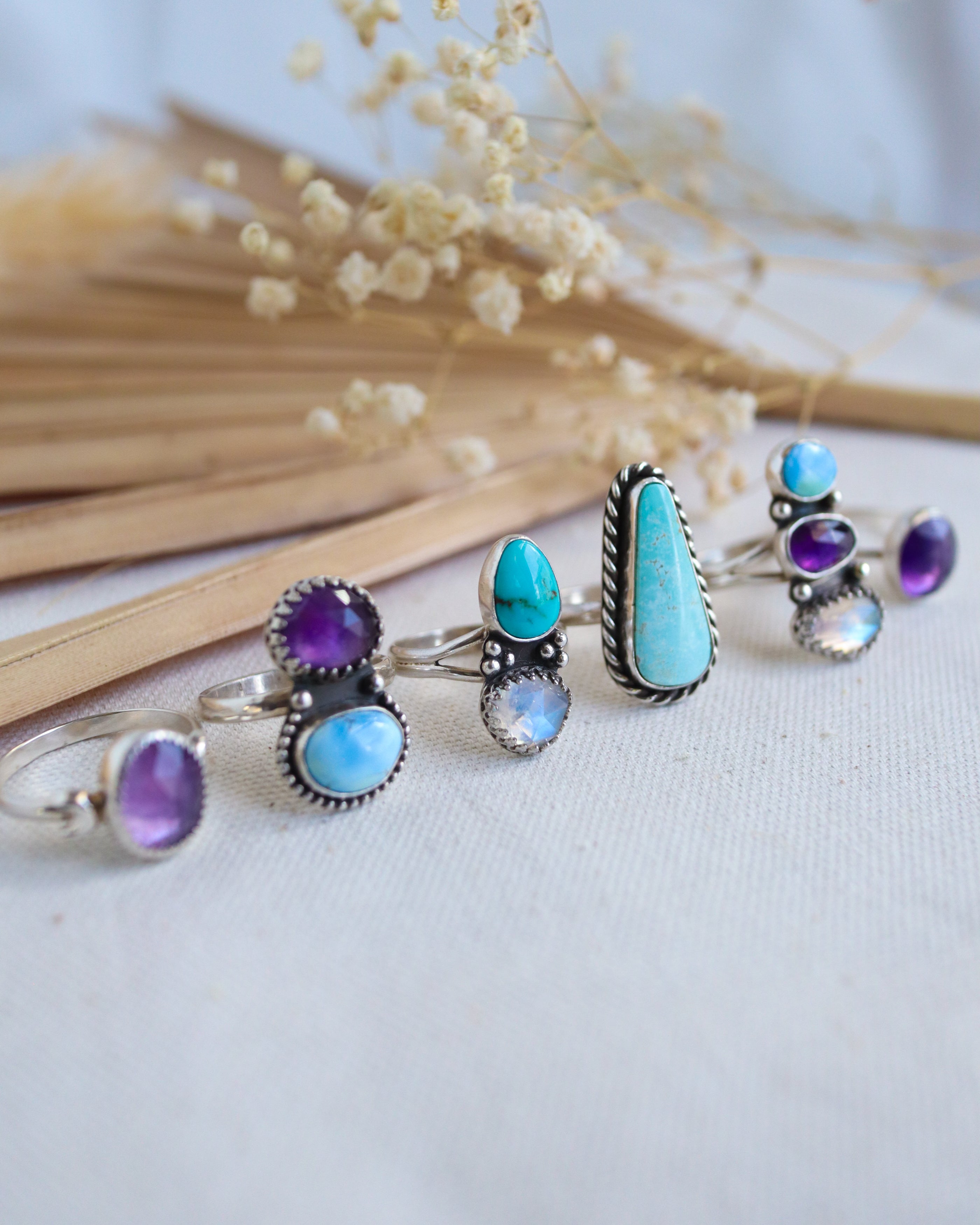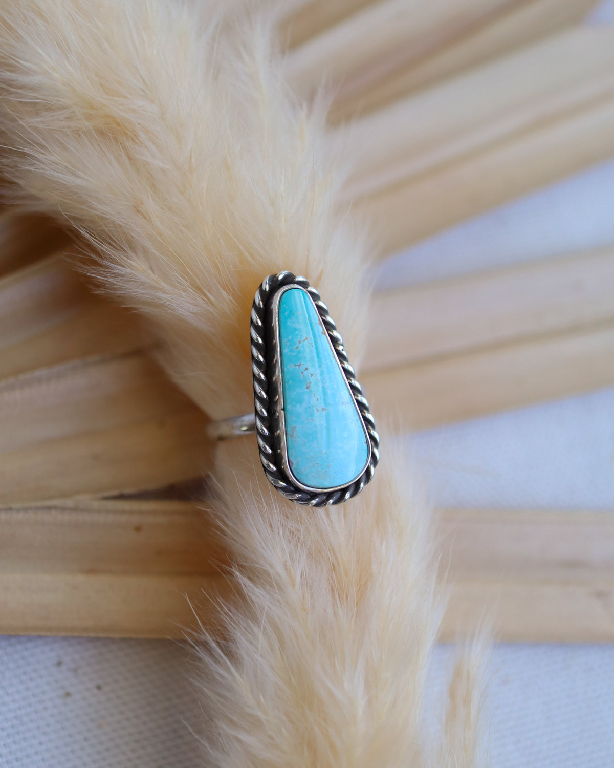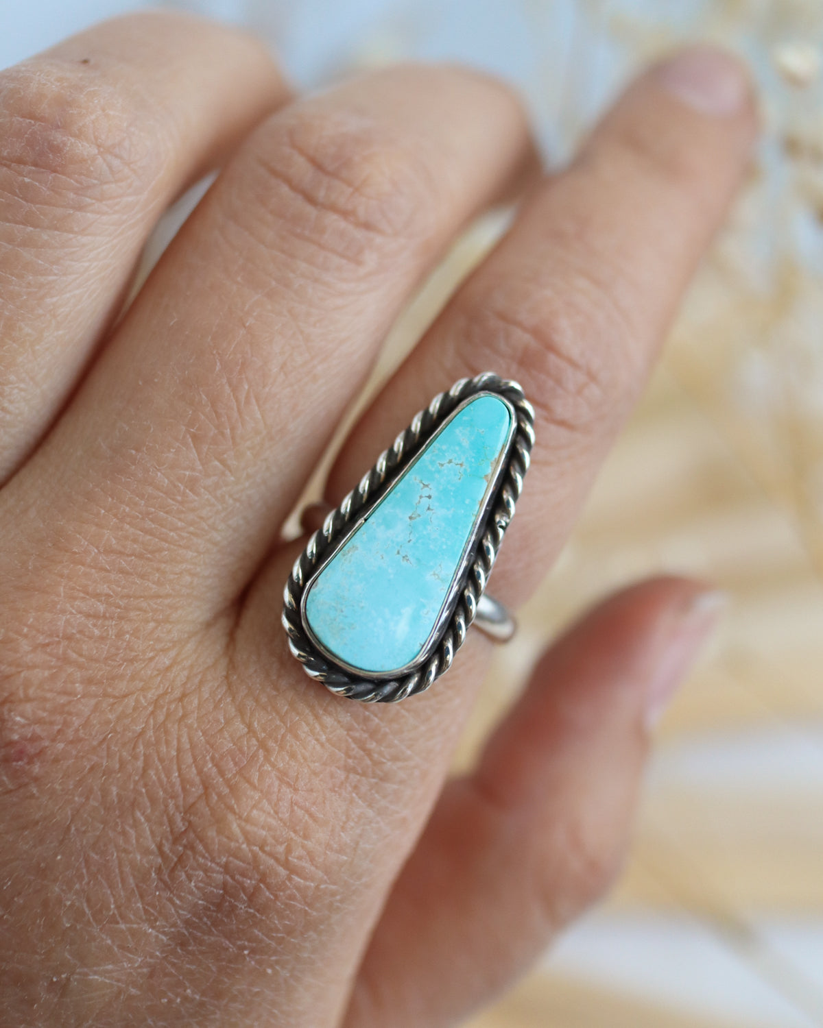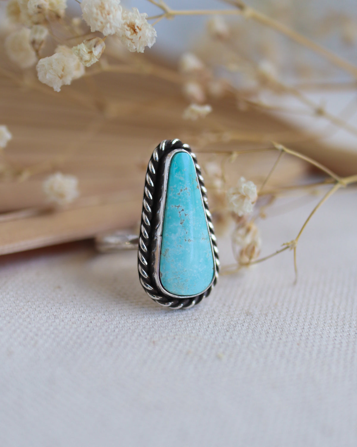 Get ready to turn heads with our one-of-a-kind turquoise ring! Featuring a beautiful turquoise framed by twisted silver wire, this ring is a true statement piece. Embrace the beauty of nature and add a pop of color to your look with this stunning and unique piece.