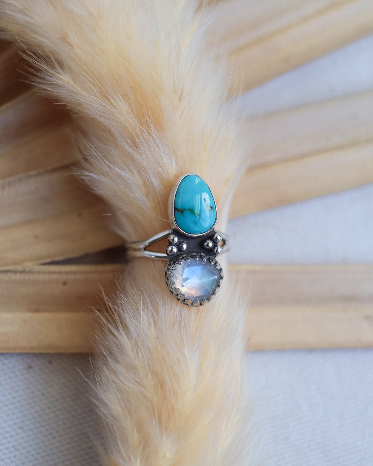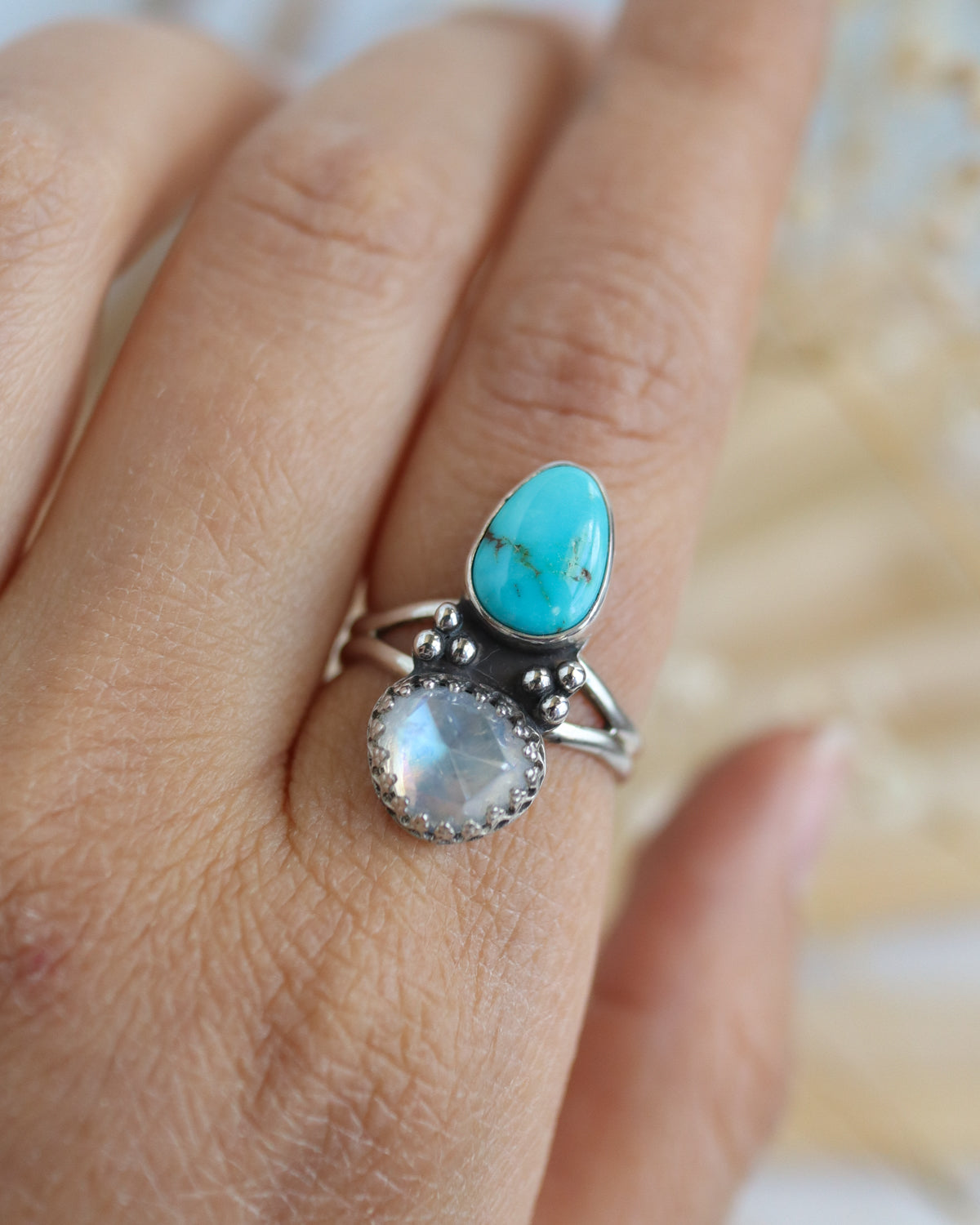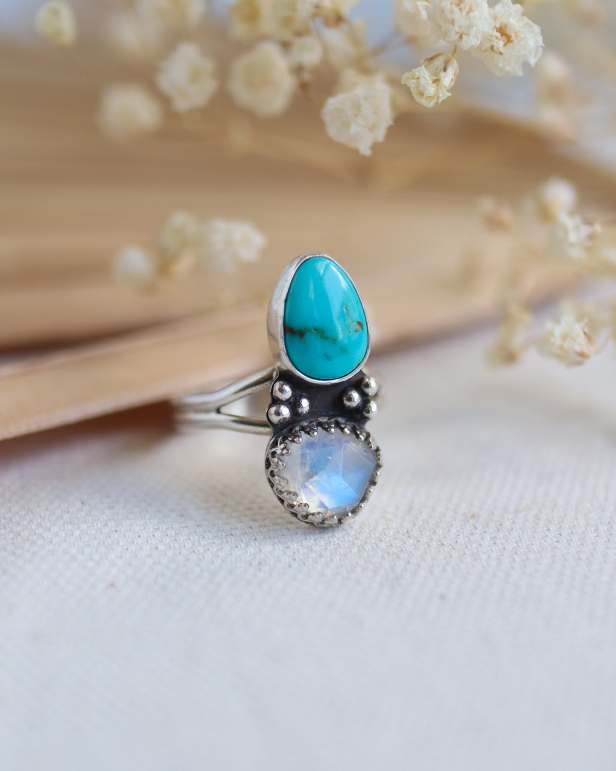 Moonstone and turquoise come together in this unique ring, each carrying its own special energy. Moonstone, a master healer for women, emanates a nourishing, deeply feminine energy, promoting healing and wholeness. It is connected to mother moon, the healing waters, and sacred feminine energies.