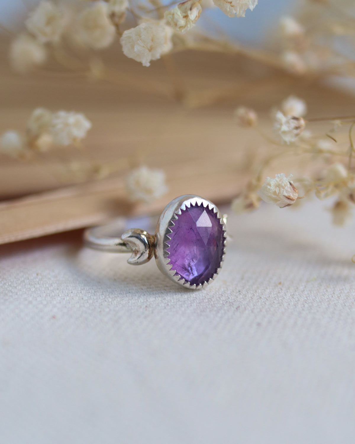 This one-of-a-kind Amethyst ring is embellished with pretty silver moons and features a serrated bezel. Delicately crafted, this beautiful piece is as unique as you are.