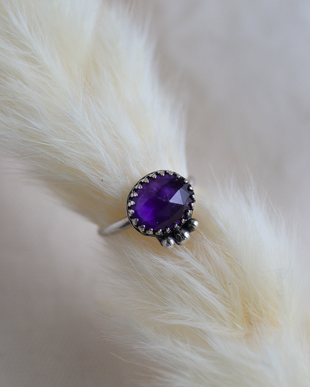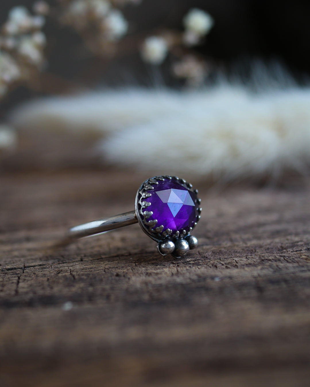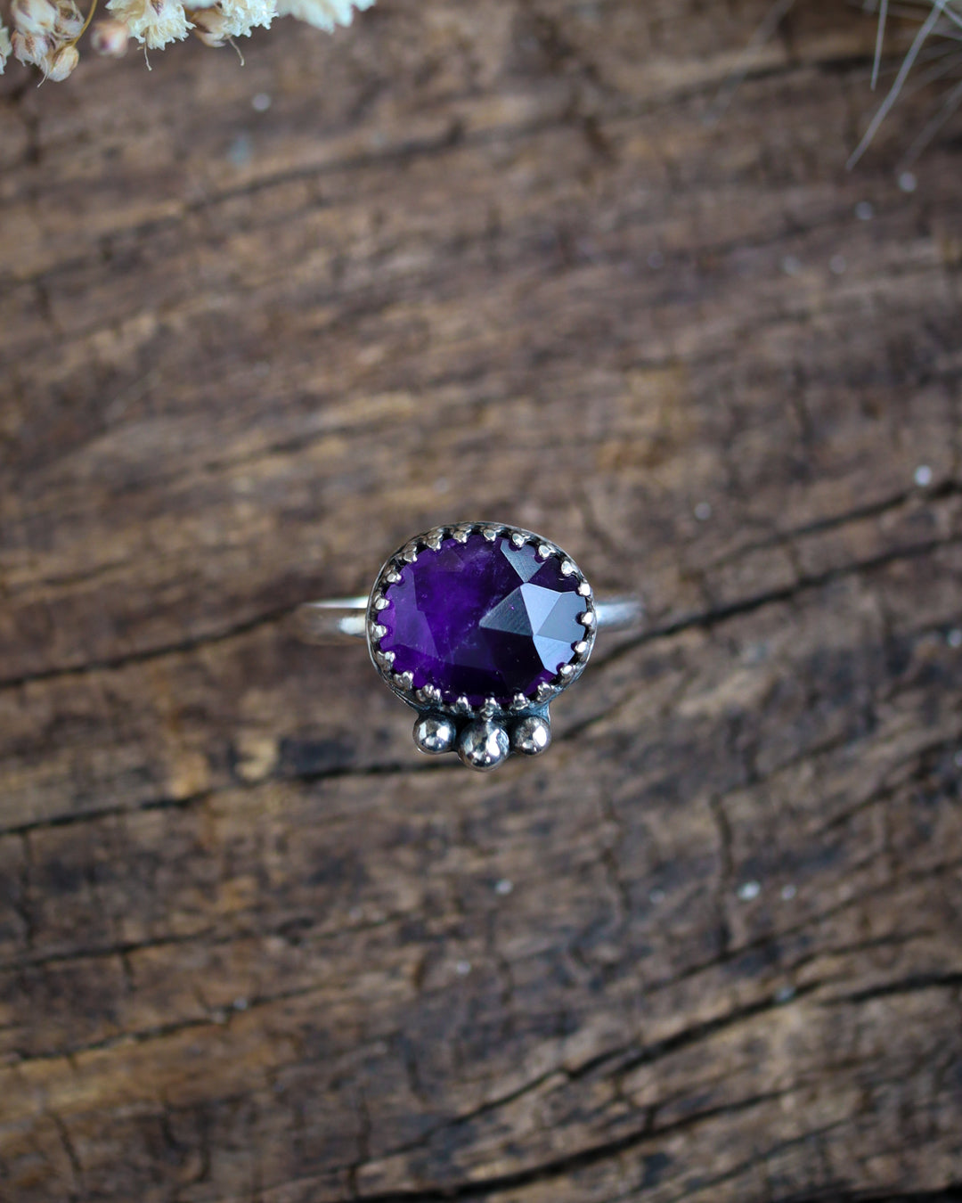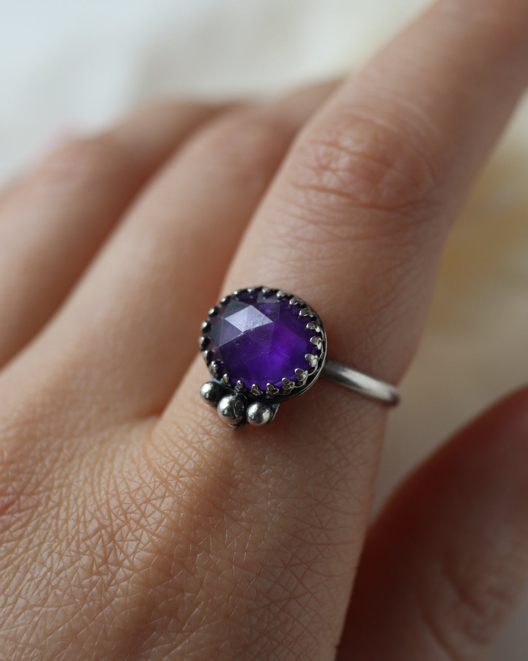 Beautiful one-of-a-kind natural Amethyst ring. Handmade using a pretty silver crown bezel setting and embellished with tree tiny silver beads. Ring has been oxidized and then polished to bring out highlights.