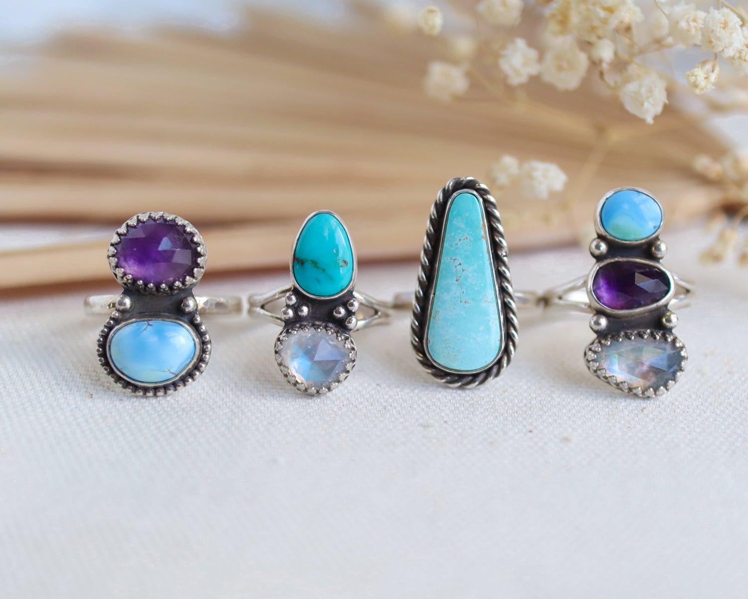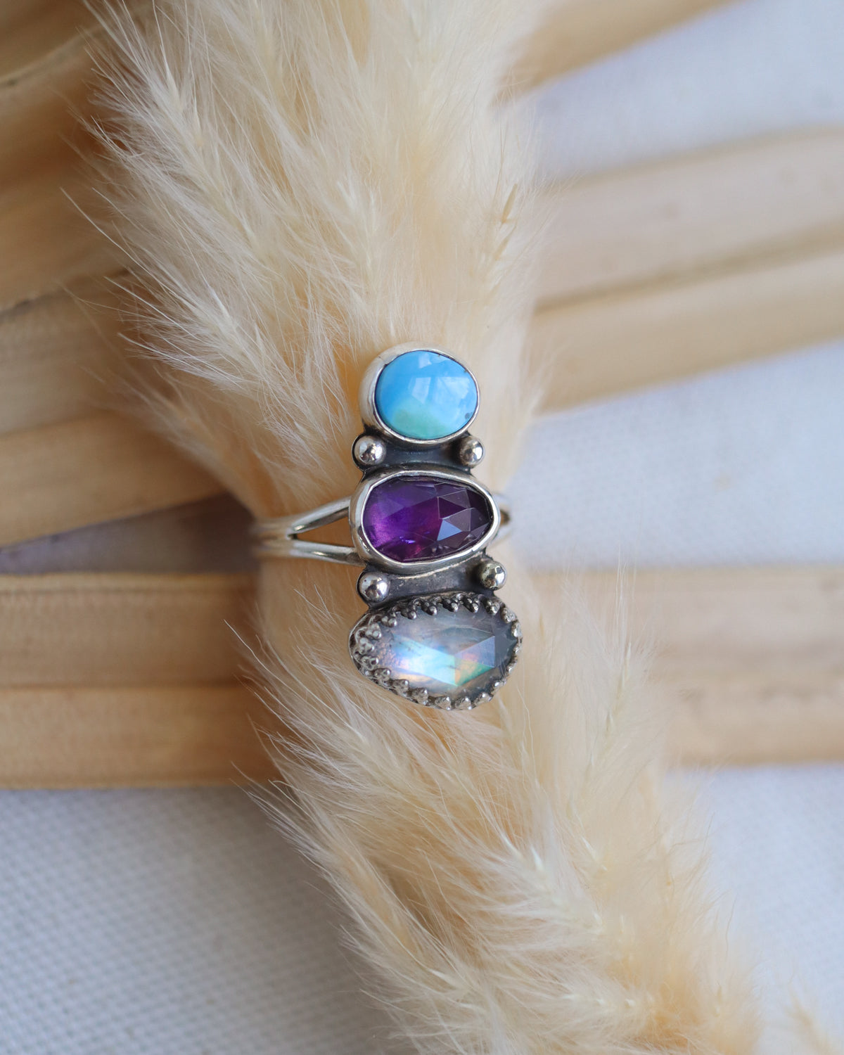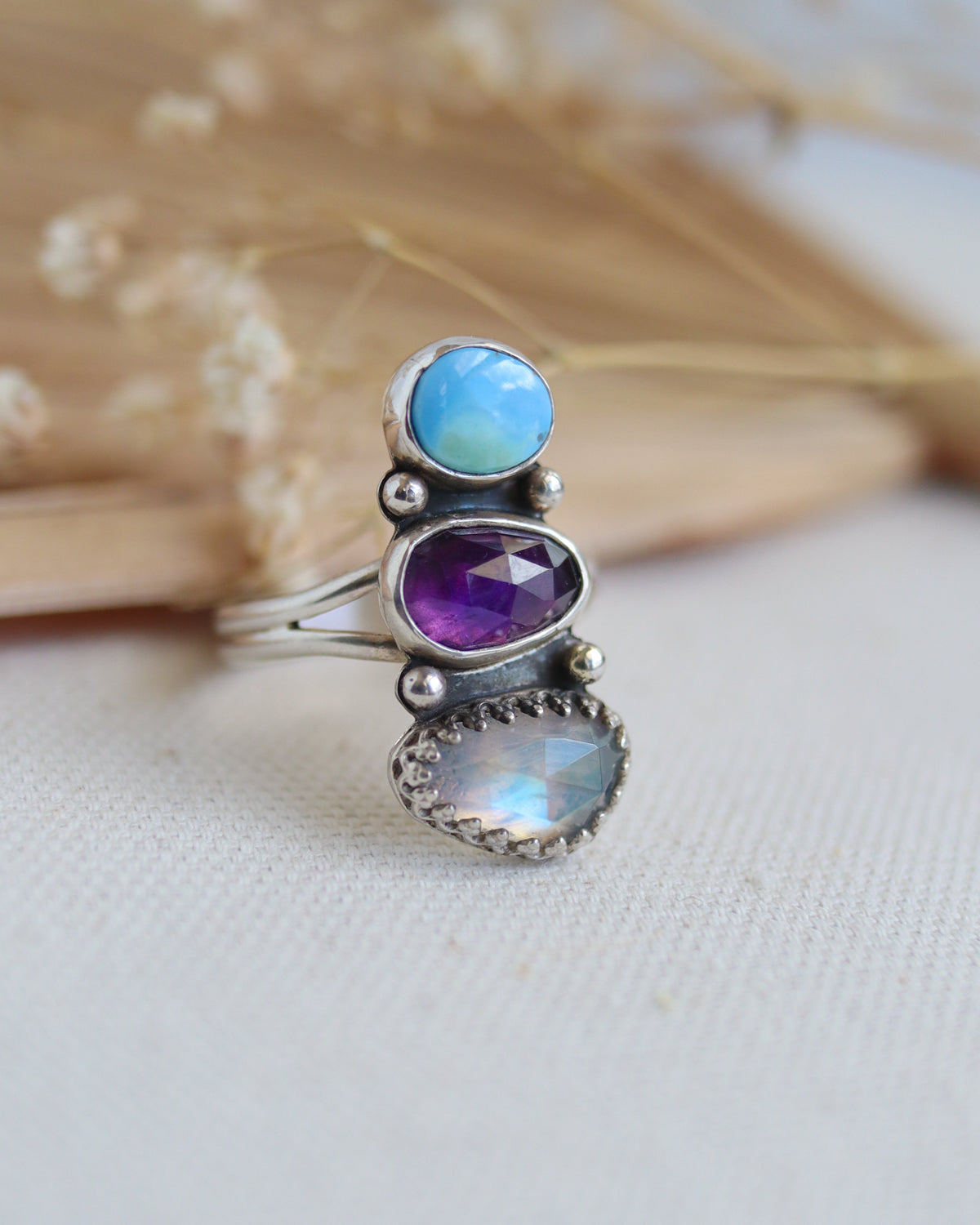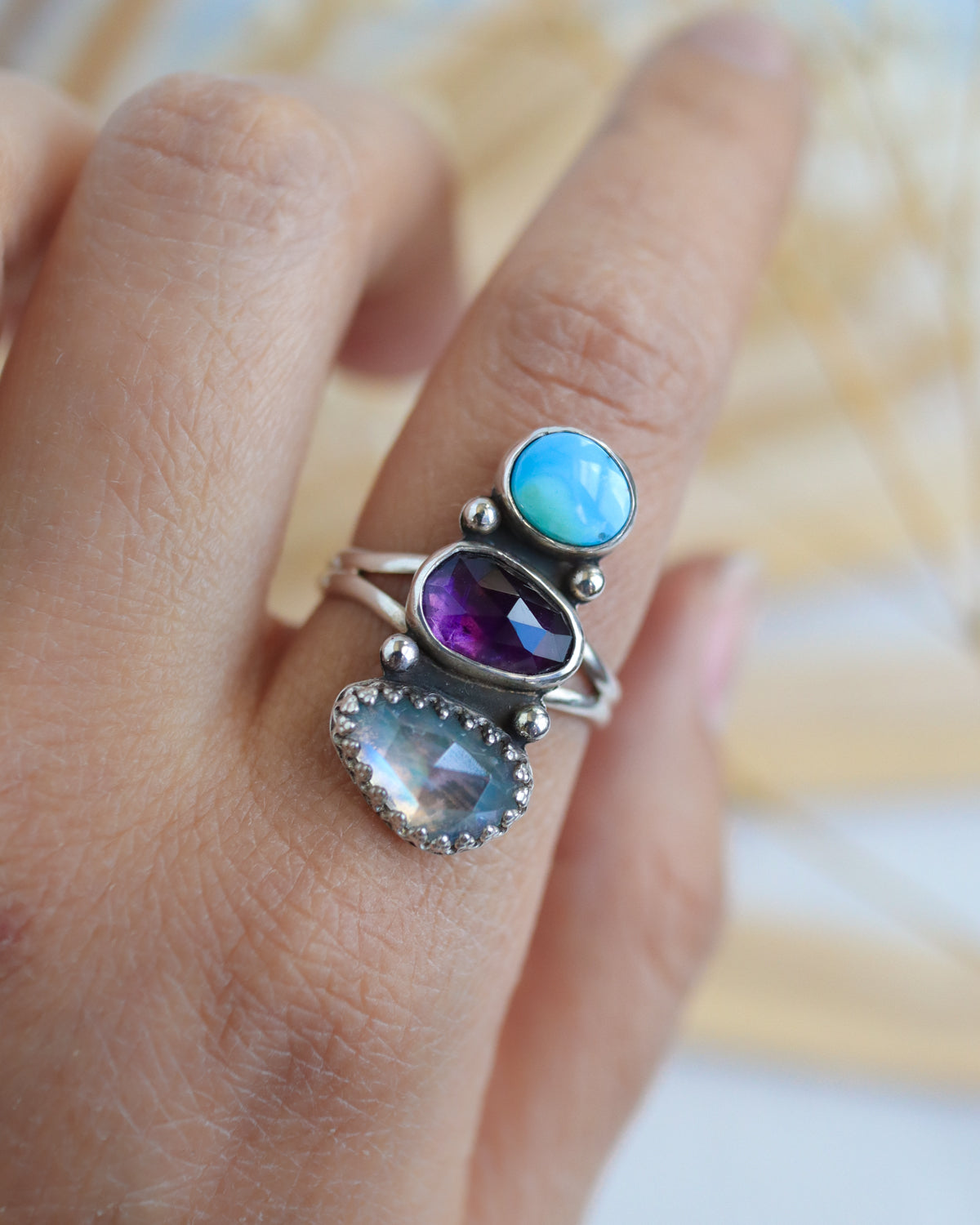 This beautiful one-of-a-kind ring has been made out of sterling and fine silver. It features three stones: Golden Hills Turquoise, Amethyst, and Rainbow Moonstone which together create a harmonious blend of colors, offering you a sense of balance and positivity. Wear this ring as a symbol of your journey, reminding you to embrace life's harmonious moments and find joy in every step you take.