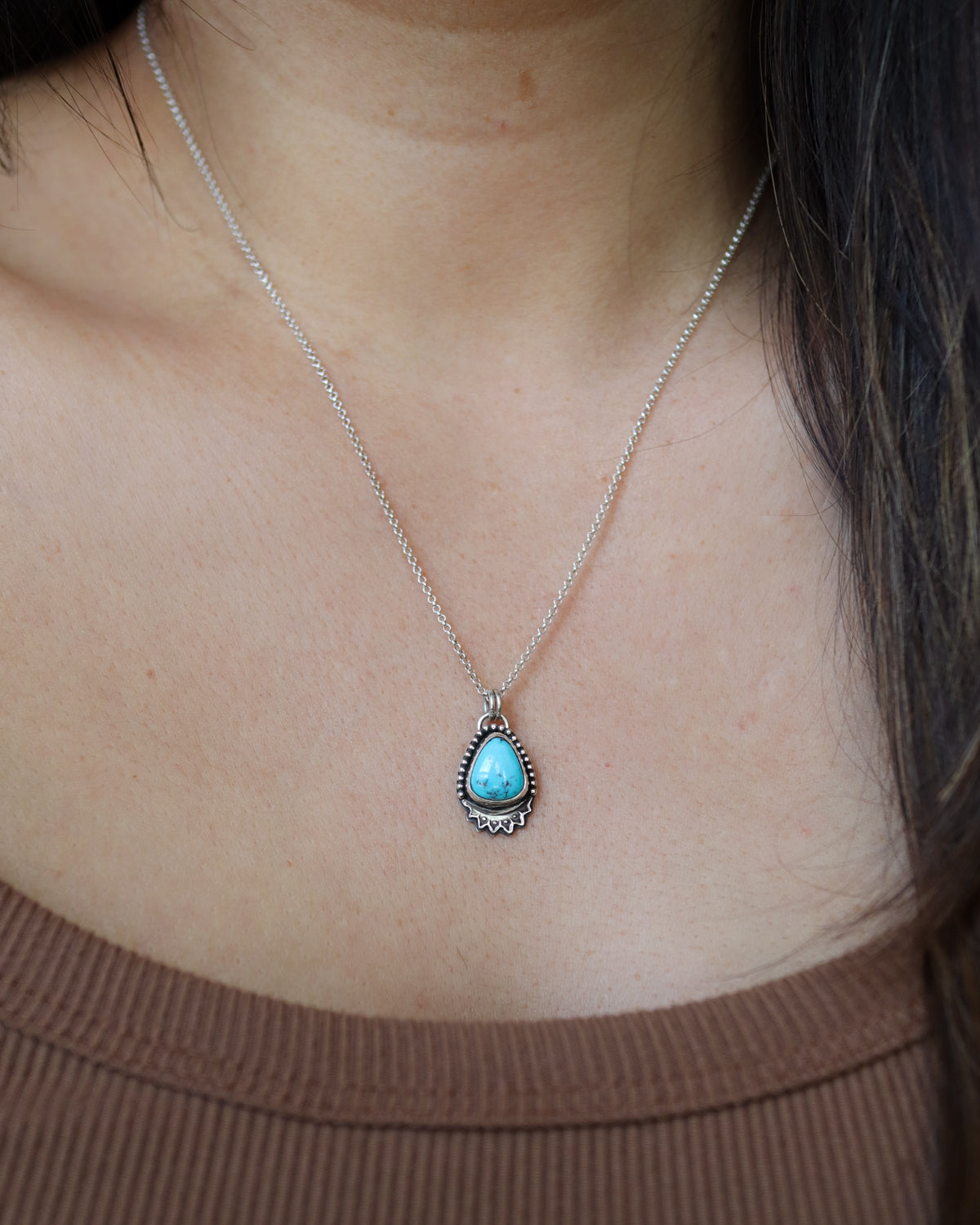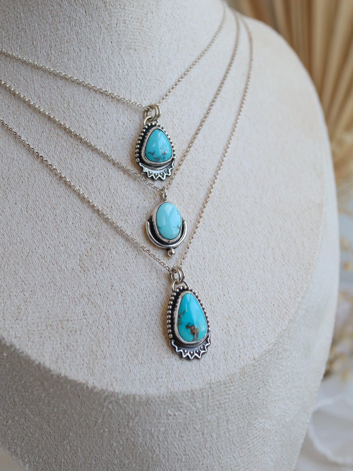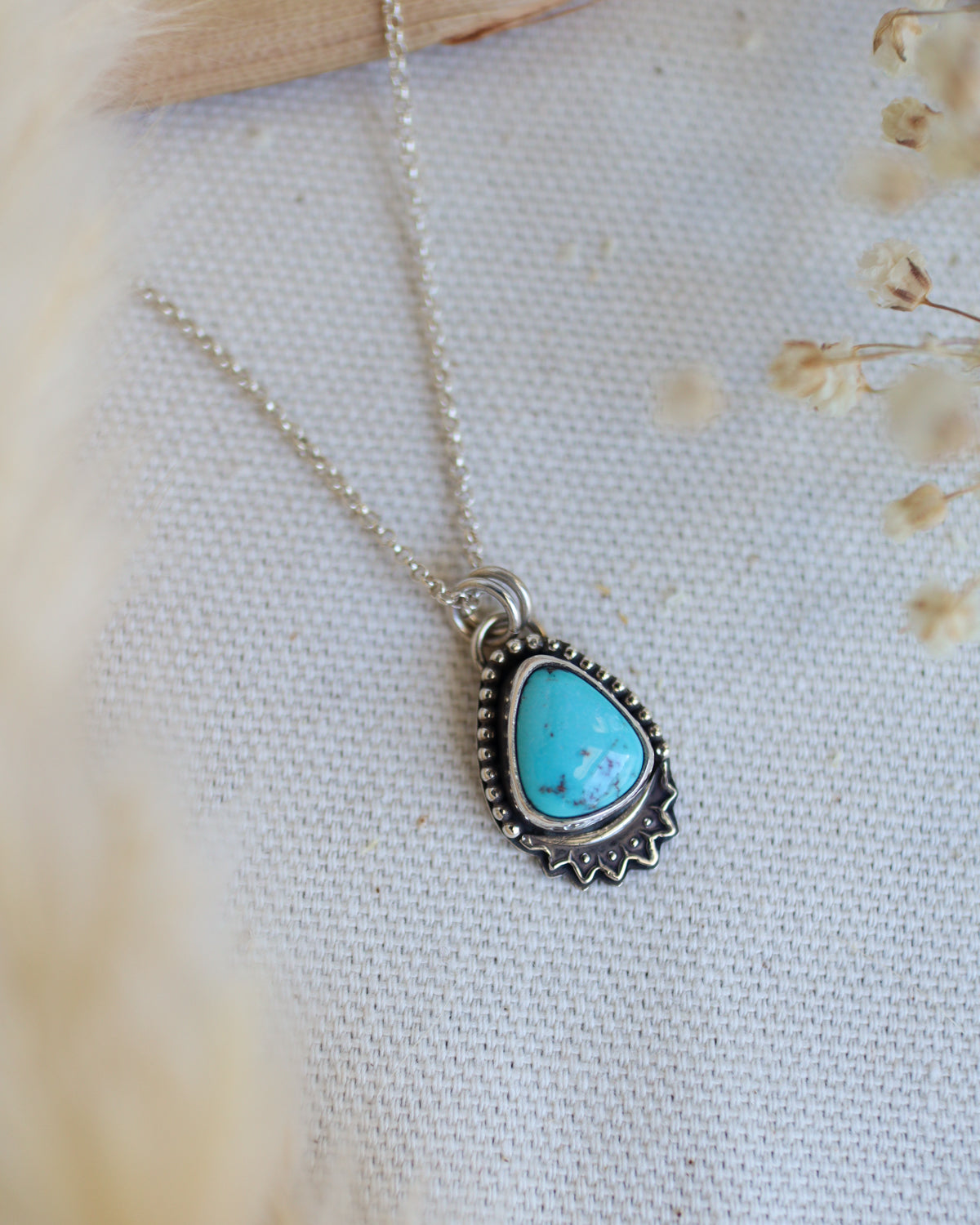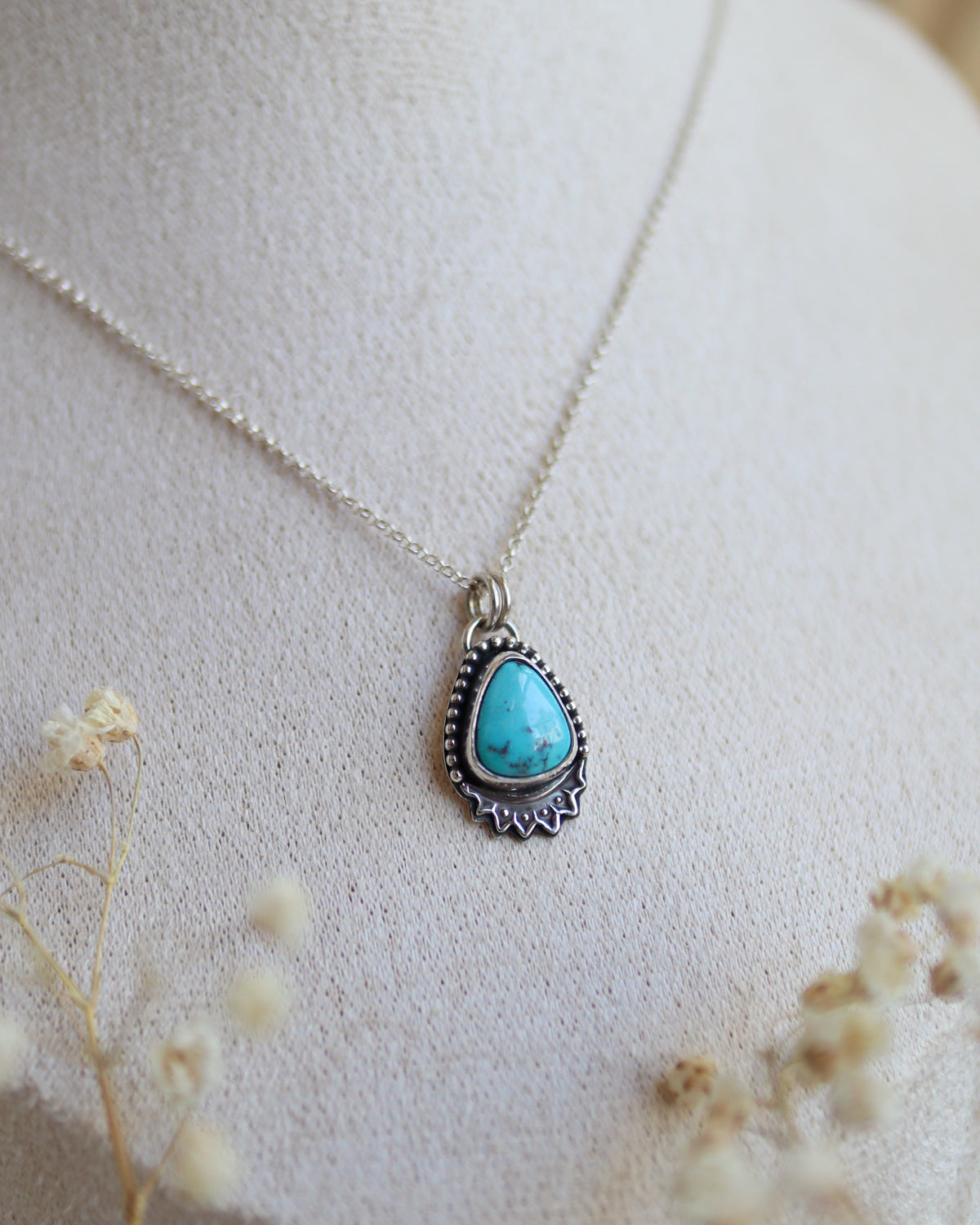 One-of-a-kind turquoise necklace with beautiful blue hues. It's embellished by a frame of tiny silver beads and stamped details that have been oxidized and then polished to create contrast and bring out highlights.
